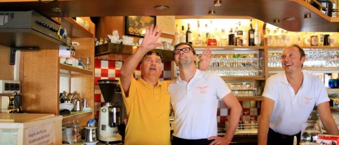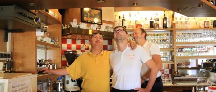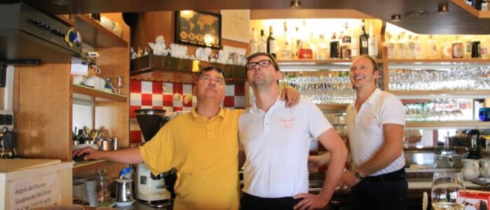 Introductie: Restaurant Agli Angeli in Pertegada. Andrea, Angelo & Carlo Tria. Alleen al de achternaam Tria is om twee redenen bijzonder: ten eerste betekent de achternaam van deze drie heren heel toepasselijk ‘drie’ en ten tweede dragen de heren niet de achternaam van hun vader maar van hun moeder. Iets wat eind jaren 60 in het traditionele Italië niet echt gebruikelijk zal zijn geweest…..