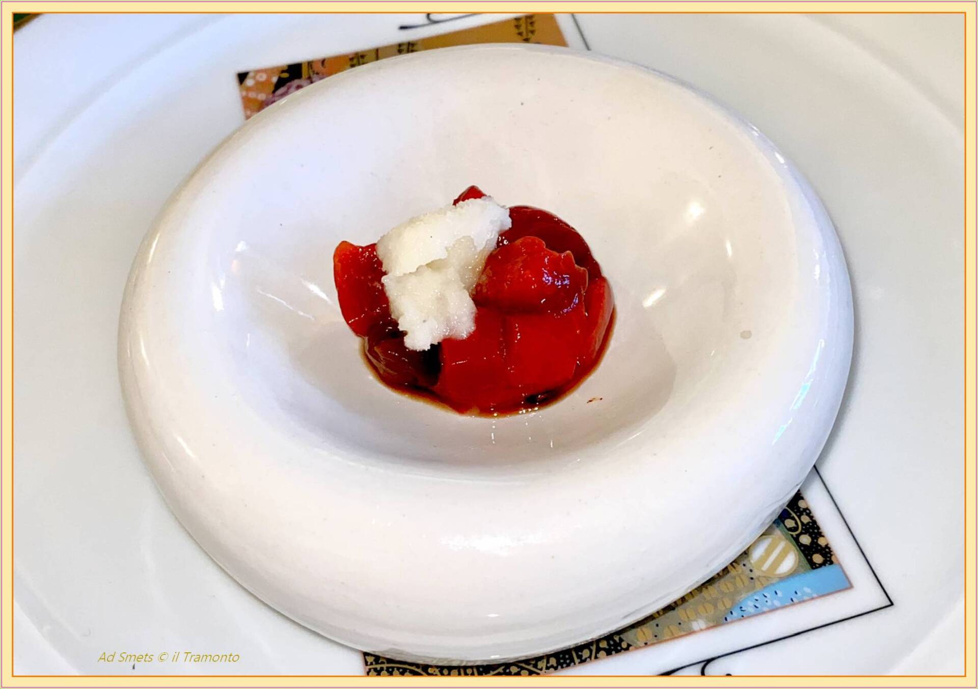 * geroosterde paling met een sorbetto in het zuur. In het Friulaans wordt dat ‘saòr’ genoemd. Het is een fypisch Friulaanse dressing van suiker, azijn en uitje uit de regio.