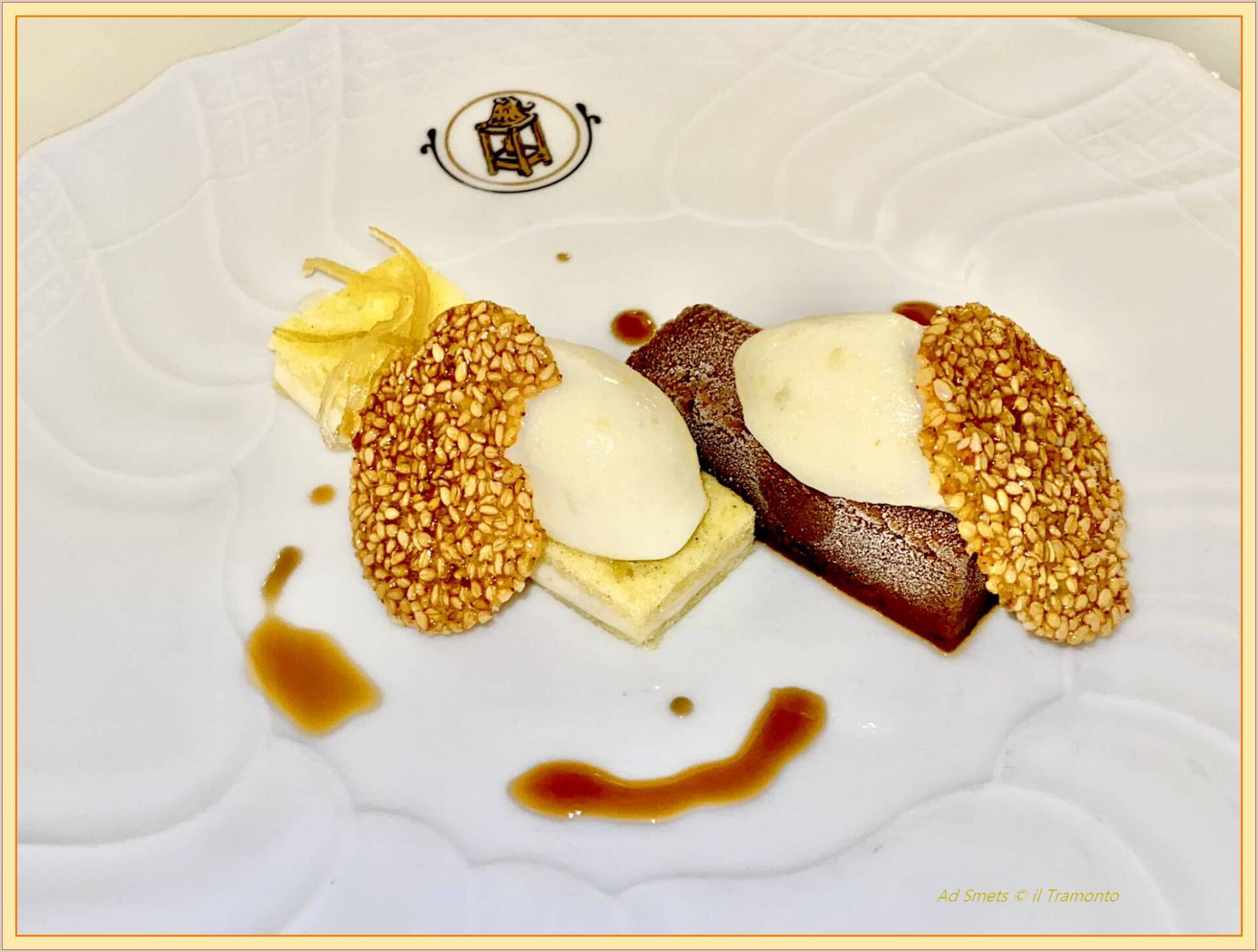 De vriendelijke dame die ons de ganse avond bediende en waarmee we inmiddels een warm contact hadden opgebouwd, toonde vol trots het plateau met de zoveelste keer prachtig opgemaakte borden. Zij had ons tussendoor al verzekerd dat onze bermuda’s echt geen probleem waren en dat ze ons inschatten als mensen die pasten bij dit prachtige deel van het restaurant! Met smaak startten we en alweer alsof een engeltje op je tong pist. Wel vonden wij een klein deel van het dessert, een combinatie van chocolade met verse citroen, heel apart, om het netjes uit te drukken. Reden om dit bij de chef-kok na te vragen, want wij zouden nooit voor deze combinatie hebben gekozen.