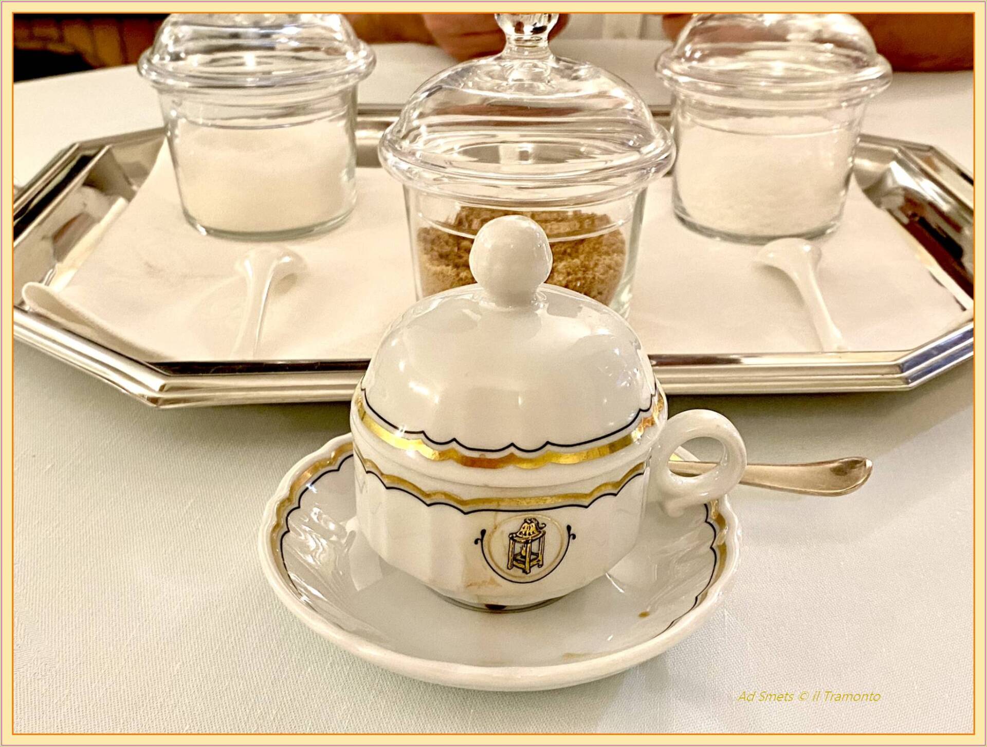 Een prachtig gedekte tafel in een apart zaaltje: de korte broeken apart van de lange! Onze autotasjes kregen een eigen ministoeltje want het hoort niet dat zoiets los aan de stoel bengelt noch op de grond verloren ligt. “Zo, zo, dit is wel klasse, Sjaak! Hebben we ons niet toch een beetje verkeken op de mate van sjiekheid van dit restaurant?”