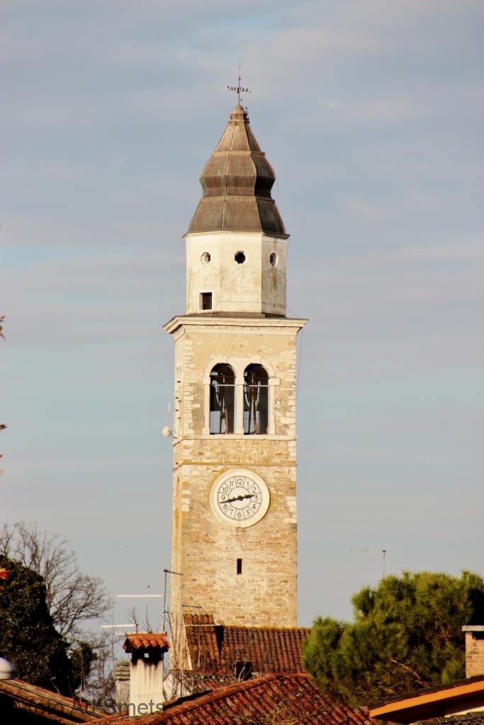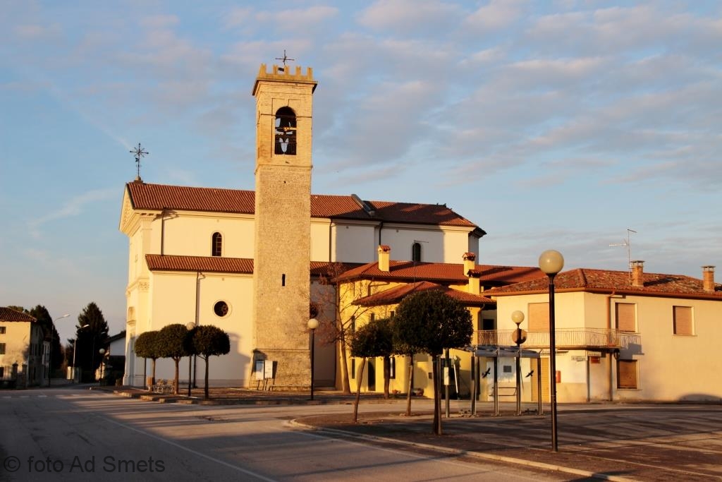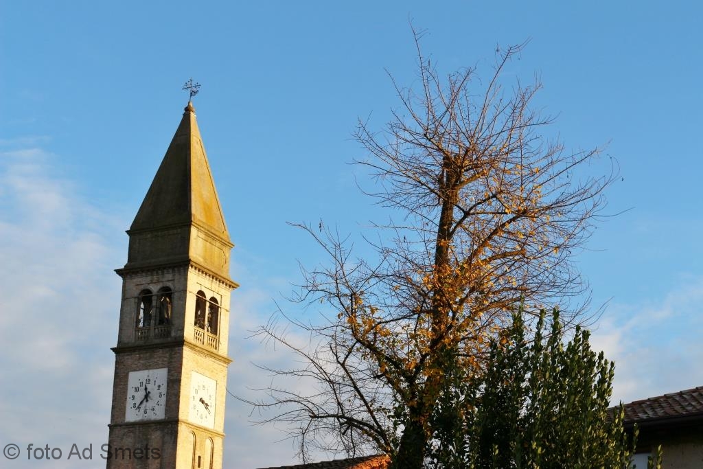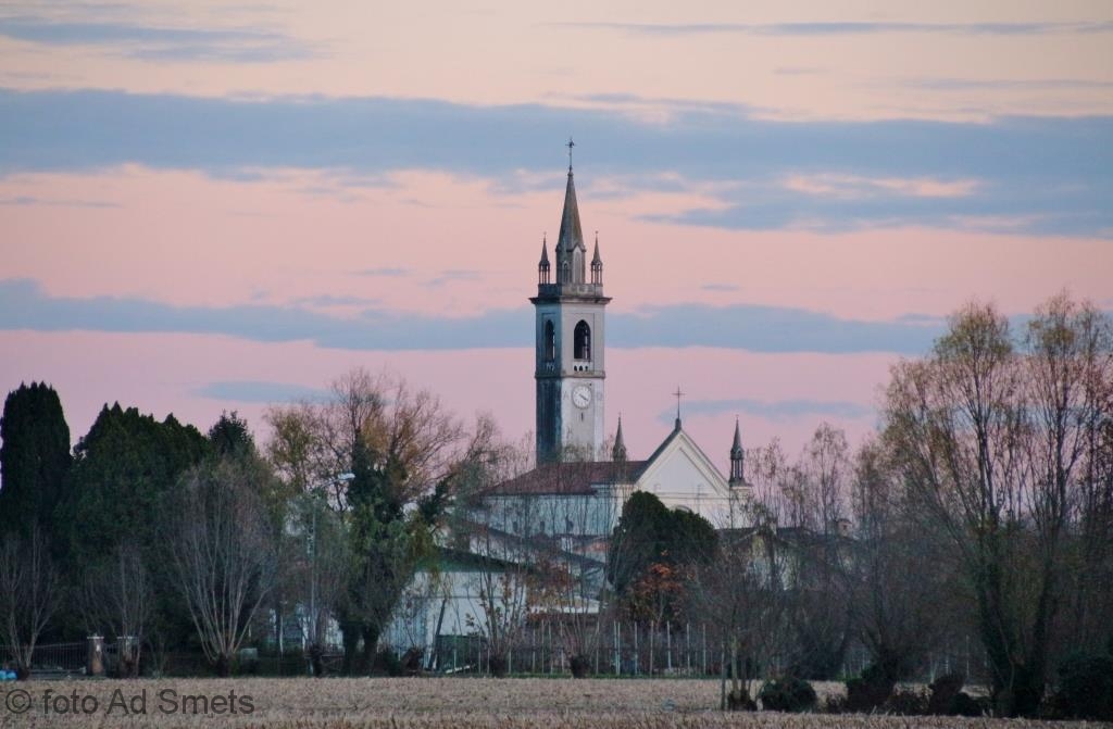 Achtereenvolgens zie je de kerktoren van Rivarotta, dan die van Varmo, die van Gradiscutta, van Piave di Rosa en dan in de ondergaande zon de kerk van Bugnins.