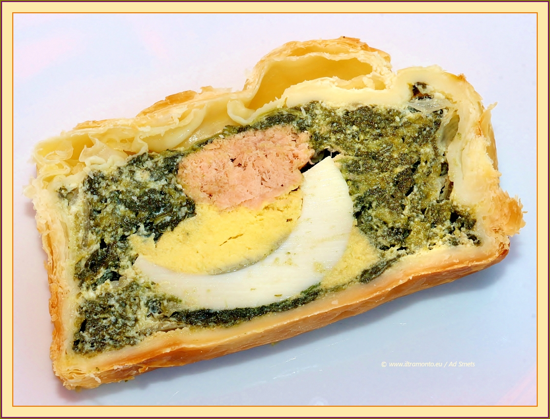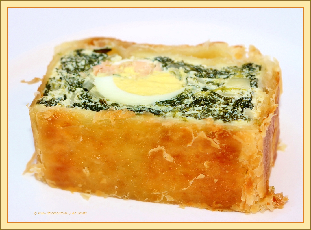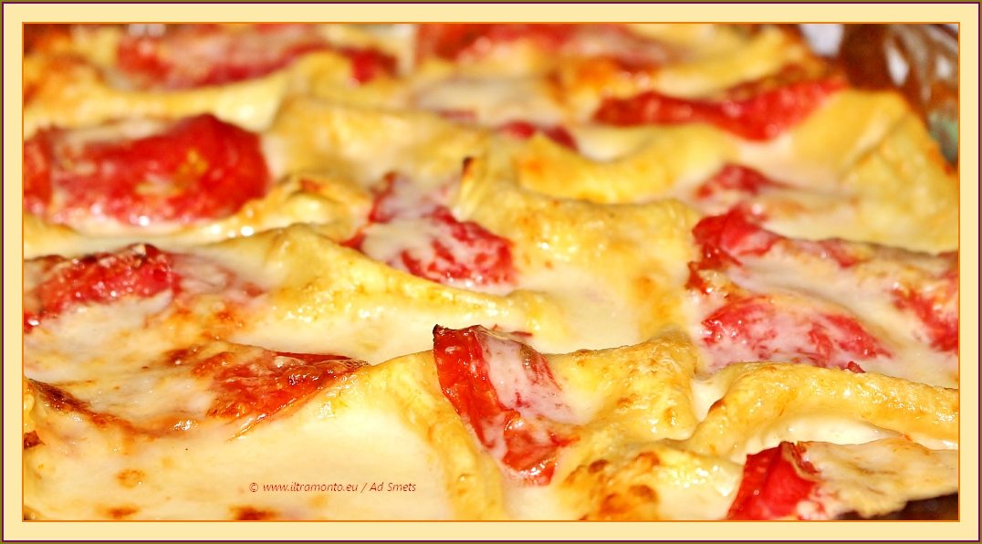 Menu: een strudel met zalm, spinazie, ei en ricotta (met gefruite bosuitjes en voldoende knoflook). Verder een variant op lasagne met gegrilde aubergine, gekookte ham, mozzarella, grana padano en in plaats van de gebruikelijke tomatensaus dit keer heel veel verse tomaten. Ja, we eten ons in de zomer ongans aan tomaten. Ook gisteren kregen we weer van een Italiaanse vriend 3 kilo tomaten. En de voorraad van de week te voren was nog niet eens op.