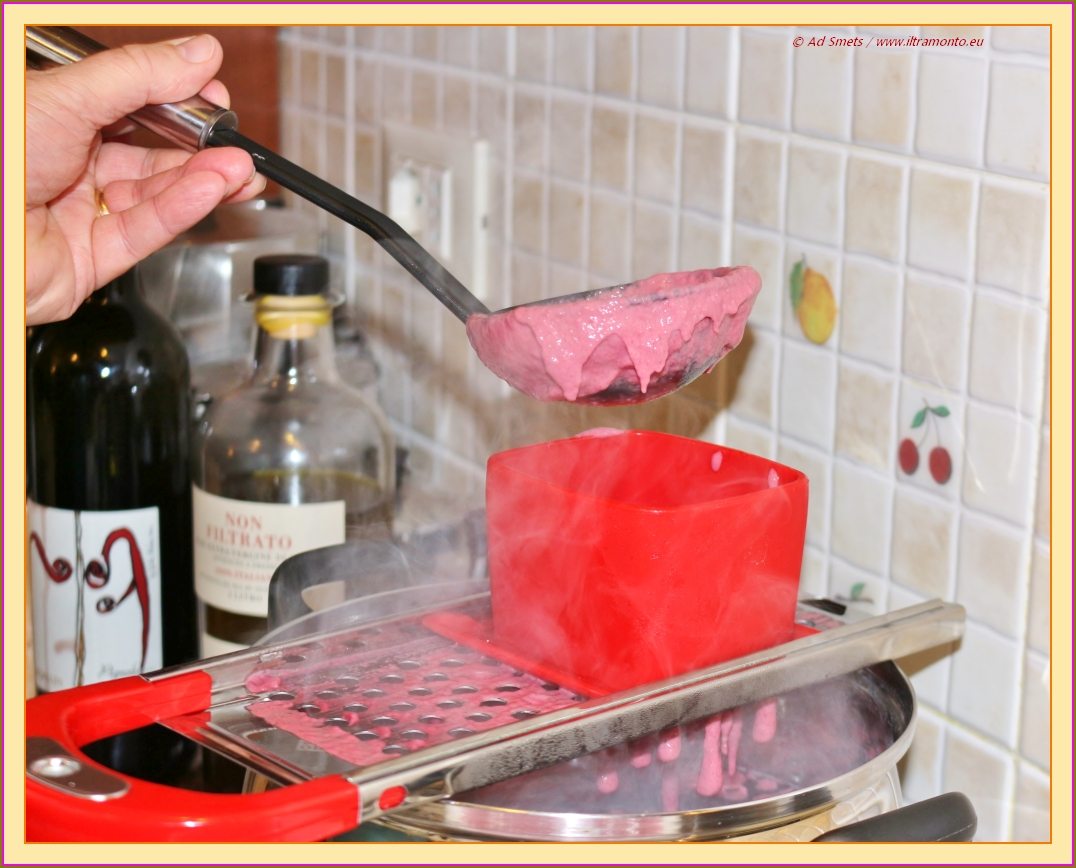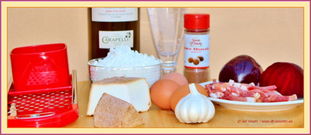 Snij de rode bieten in kleine stukjes, evenals de knoflook en pureer deze met een staafmixer samen met de helft van het water en 1 ei tot een gladde massa. Neem nu de gewone mixer, voeg de andere 2 eieren, peper & zout, een eetlepel olijfolie en nootmuskaat toe. Mix nu telkens een deel van de bloem en het water toevoegend. Meng totdat je een elastisch deeg hebt, een beetje zoals zachte kauwgum (zie foto’s). Voeg eventueel nog een scheut water of een eetlepel bloem toe. Laat het deeg even ‘rusten’ (minstens 20 minuten), zodat het nog iets elastischer wordt.