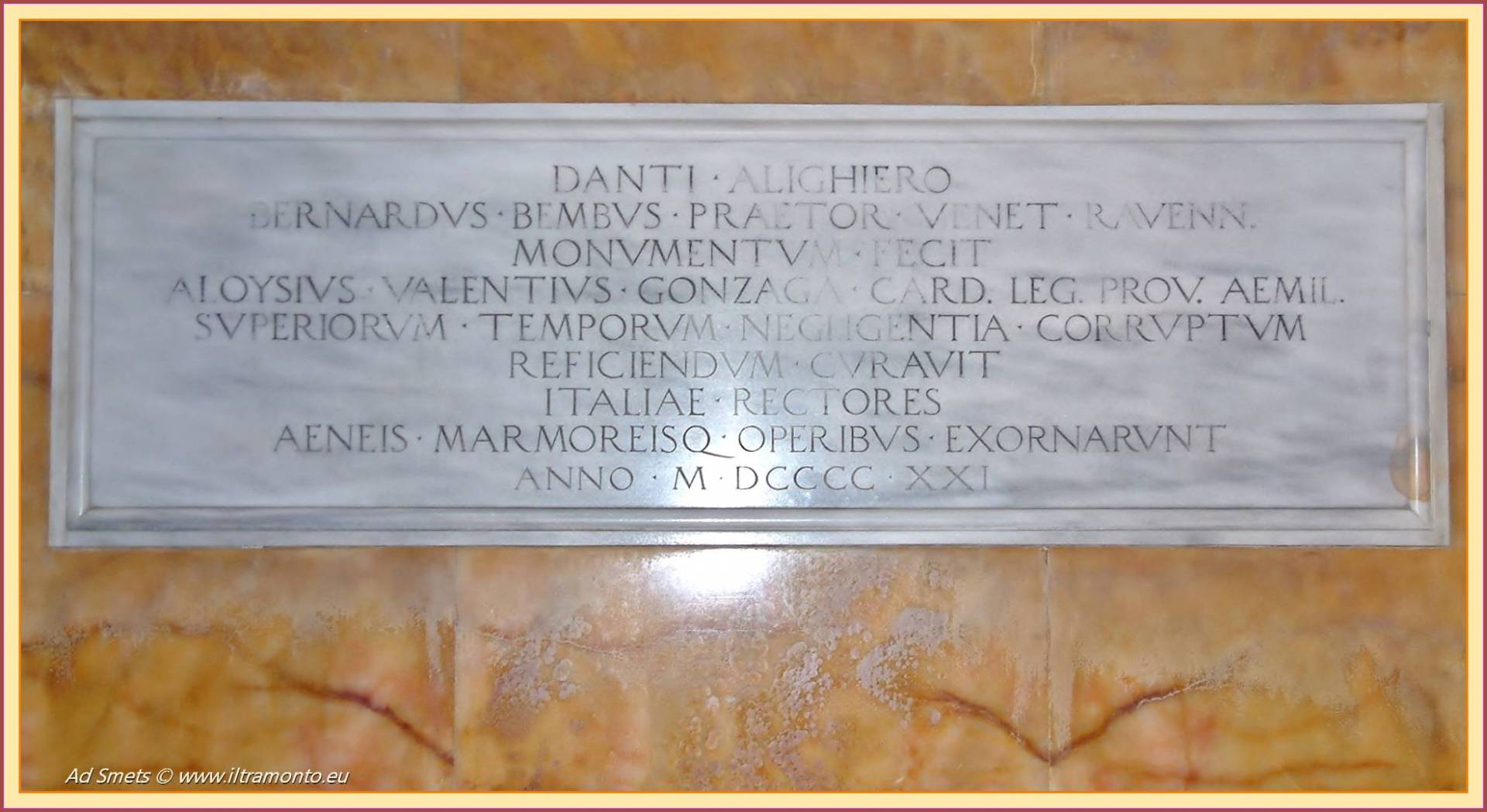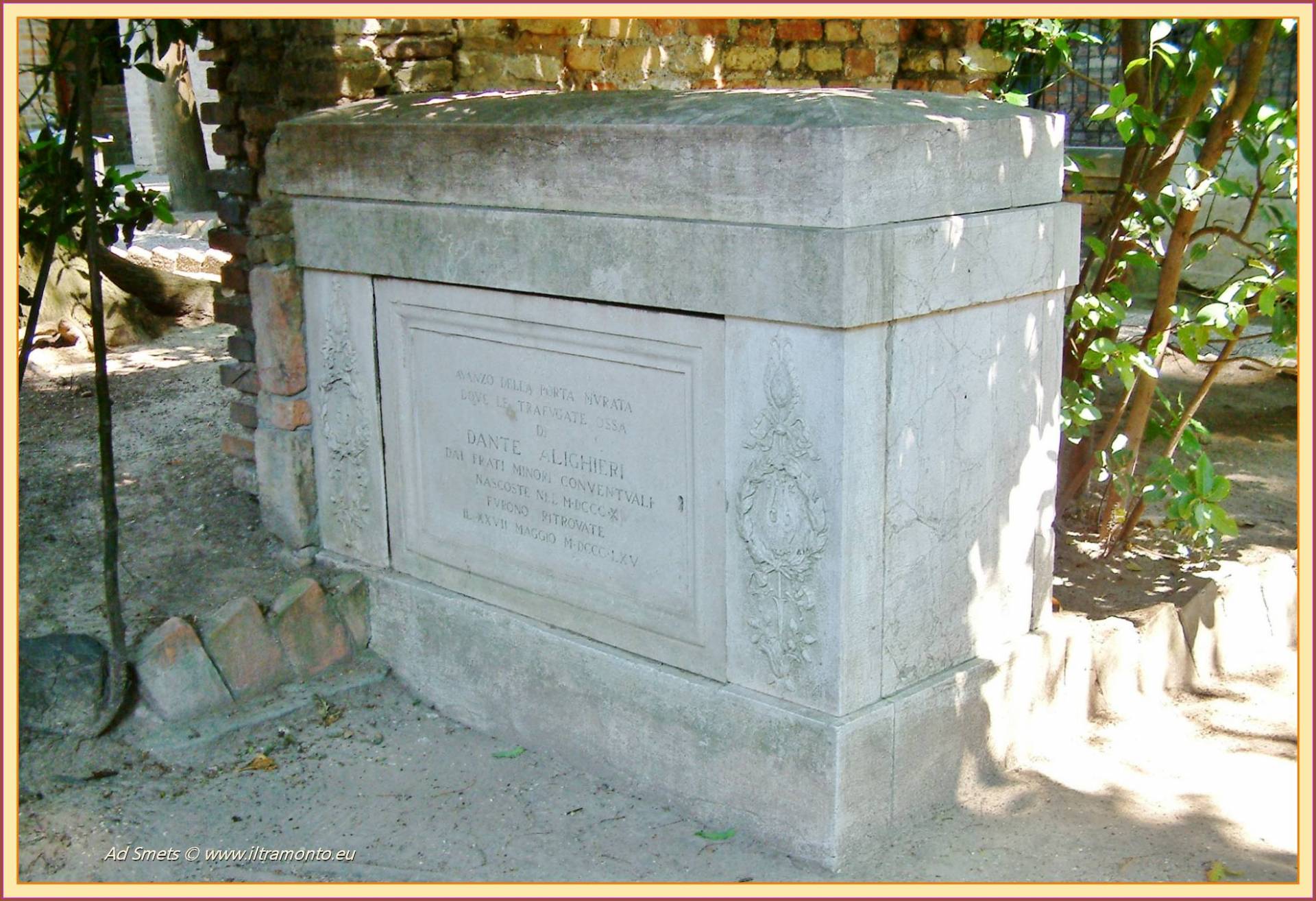 Vanwege zijn kritiek op de politiek werd Dante in 1302 verbannen uit zijn geboortestad Florence en is hij gevlucht naar Ravenna. Hier stierf hij – nog steeds in ballingschap zijnde – in 1321 en hier ligt hij begraven. Moge hij rusten in vrede te Ravenna! Dat is de vraag want al lange tijd bestaat er ruzie tussen Florence en Ravenna om zijn overblijfselen! Voorlopig blijft hij in Ravenna. De nog immer lege graftombe te Florence kun je gaan bezichtigen in de Basilica Santa Croce. Té laat erkende zijn geliefde vaderstad Dantes grootheid. Het Florentijnse gemeentebestuur zendt sinds 1325 jaarlijks een kruik met olijfolie en een palmtak naar Ravenna met het verzoek de stoffelijke resten van ‘Onze Grootste Zoon terug te geven opdat de beenderen een rechtmatige plaats krijgen’. Een poging om in de lege graftombe te kunnen worden bijgezet, of om een extra toeristische attractie erbij te hebben!!!! De magistraten van Ravenna blijven, zelfs in tijden van koninklijke, keizerlijke, mussoliniaanse, berlusconiaanse, pauselijke ‘overheersingen’ en tijdens wereldoorlogen correct en beleefd: “Eens verbannen, blijft verbannen”.
