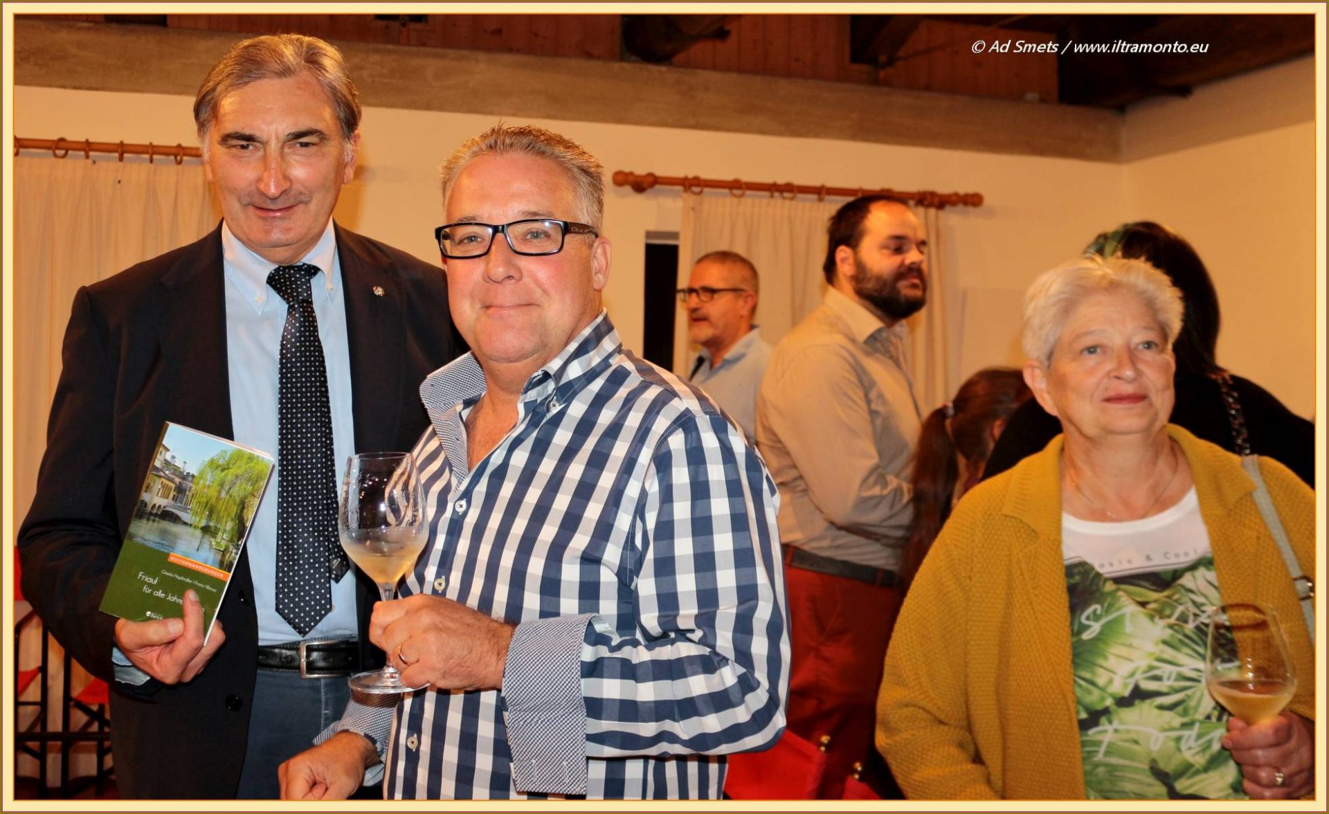 Wij waren uitgenodigd bij de presentatie van hun – inmiddels – derde boek. ‘Friaul für alle Jahreszeiten’. Zij houden meerdere presentaties, veelal in Oostenrijk. Wij kozen voor deze avond omdat het plaatsvond in hun eigen dorp Varmo, dus een soort thuiswedstrijd. Omdat wij goede banden onderhouden met de burgemeester en wethouders van dit dorp, was het tevens een plezierig weerzien. Alhoewel het boek geschreven is in de Duitse taal, was er veel belangstelling bij de Italianen, vooral uit het eigen dorp. De presentatie was eigenlijk een slideshow van foto’s van bijzondere plekjes in Friulië die zij in hun boek met begeleidende verhalen onder de aandacht brengen. In vloeiend Italiaans lichtte Gisela de foto’s toe van plekjes waar menige bewoner van deze regio zelf nog nooit geweest is.