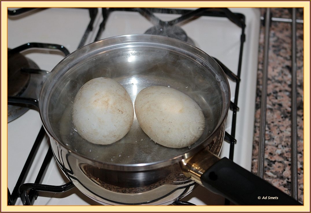 Want die wij vandaag hadden waren echt groot! Een paasei is er zelfs niets bij. Dus nam ik het kookproces van deze juweeltjes onder mijn persoonlijke hoede. Zes minuten in kokend water. Voldoende? Het was best spannend. Al snel bleek dat het ei te vers was om te pellen, dus dan maar met het mes de kop eraf slaan.
