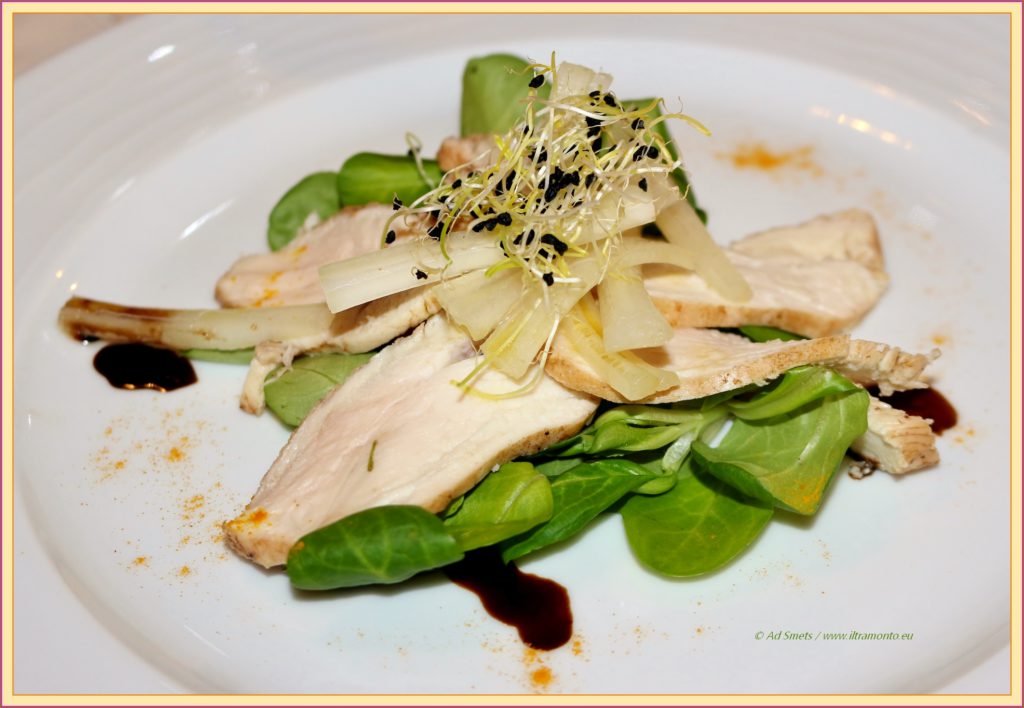 Als antipasto: gemarineerde kipfilet gedresseerd met een palletje van krokante bleekselderie. Natuurlijk met honing en bijzonder oude, delicate en kostbare balsamico. Omdat de kip langzaam sous-vide was gegaard in een marinade van o.a. honing, kan ik je zeggen dat dit de lekkerste en sappigste kip was van de laatste jaren die ik gegeten heb. SMULLEN !