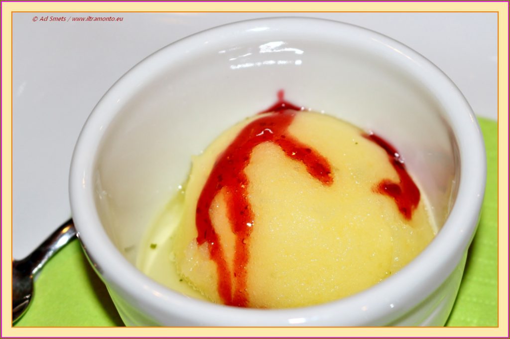 Sorbetto: om de eetlust hernieuwd op te wekken had de chef-kok een sorbet gemaakt van cedro (sukade) met mint, natuurlijk met honing. Geweldig lekker met inderdaad nieuwe honger tot gevolg!