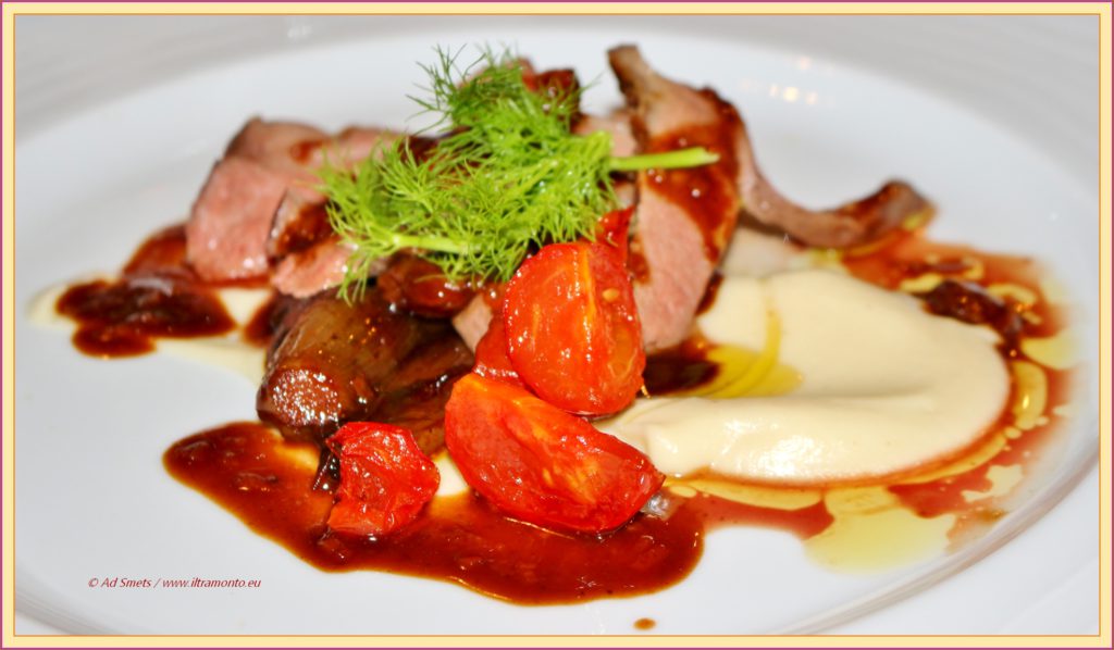 Il Secondo: eendenborstfilet met een op basis van honing gekaramelliseerde saus met een luchtige knolselderiepuree en in wijn gestoofde scalogni (wilde sjalotjes).