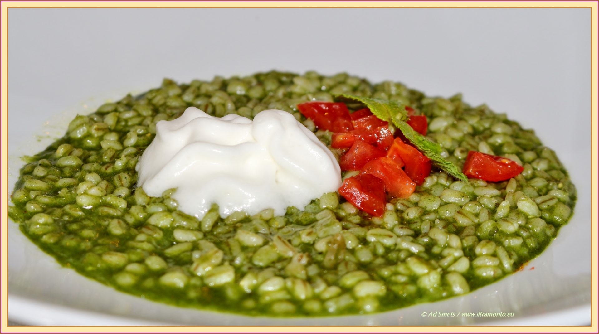 Primo piatto: orzotto (een soort risotto maar dan gemaakt van gekookte gerst) met een crème van brandnetels en een tartaartje van pomodorini en mint. Erbij een ‘klodder’ (ik kan het niet zo mooi verwoorden als Sjaak) schuim van honing en peperoncini.
