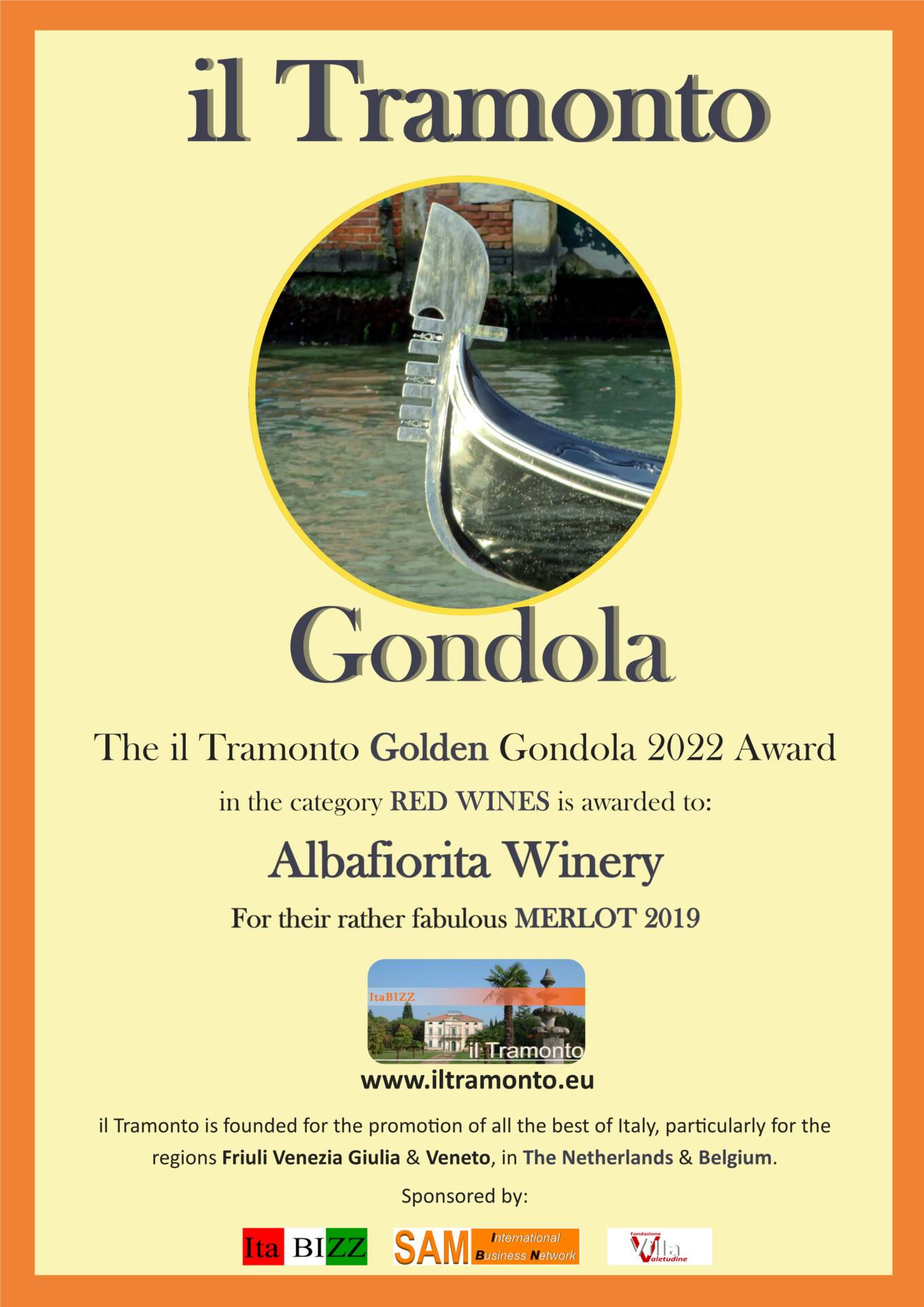 Durante la giornata del premio Gondola Dóro, la moderatrice Fabiola Tilatti ha letto la motivazione per il premio: “Alcuni anni fa, prima del Coronavirus, Adriano e Giacomo erano alla ricerca di un luogo dove i loro contatti di rete potessero tenere un workshop per manager olandesi. Nella loro ricerca di luoghi suggestivi hanno conosciuto l’agriturismo Albafiorita…loro la definiscono una perla vicino all’uscita della A4.
