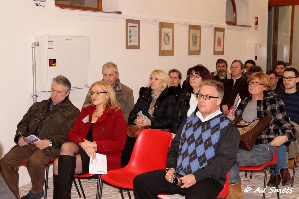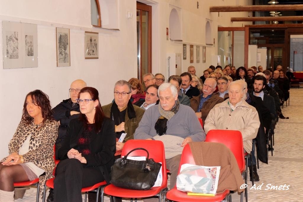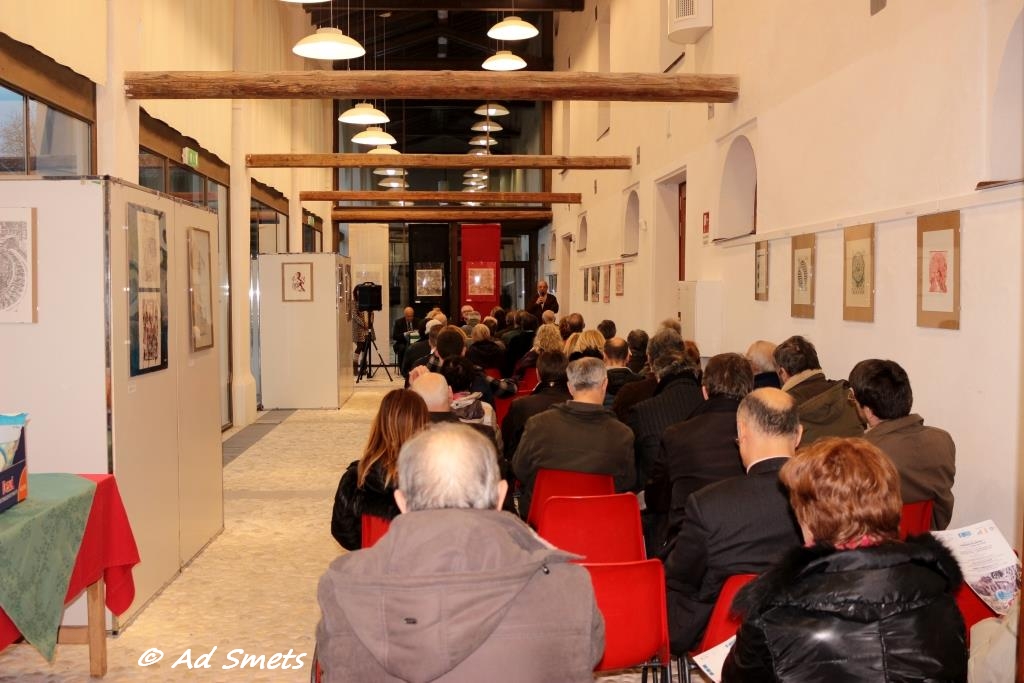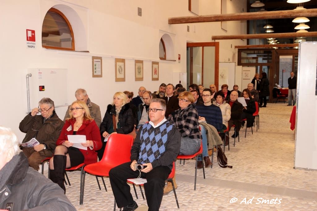 Gewapend met camera, pen en schrijfblok en een stapel visitekaartjes waren wij de enige buitenlandse gasten. Maar ook de enigen die aantekeningen maakten. De vakbondsvrouw (als ze niet praatte stonden haar kaken ook niet stil vanwege de kauwgum die zij blijkbaar erg lekker vond) maakte in haar betoog een verwijzing naar Nederland als een van de noordelijke landen die op een goede wijze omgaat met ‘werk’ en waar werknemers prachtig beschermd worden. Onze ‘angst’ om, na de banaliteiten van een groep Nederlanders die zo nodig IS praktijken erop nahouden door Rome en haar prachtige oudheidkundige beelden in stukjes te slaan, voor ‘ANIMALI’ (beesten) of BARBARI te worden uitgemaakt was daarmee in ieder geval van de baan. Wij konden ons met een gerust hart als vredelievenden flink netwerkend tussen de menigte bewegen. Onze aantekeningen zijn helaas zeer beperkt gebleven: toen de professor ging praten zonder microfoon moesten wij helaas afhaken. Dat was te moeilijk voor ons om de strekking van zijn verhaal mee te krijgen. Jammer!