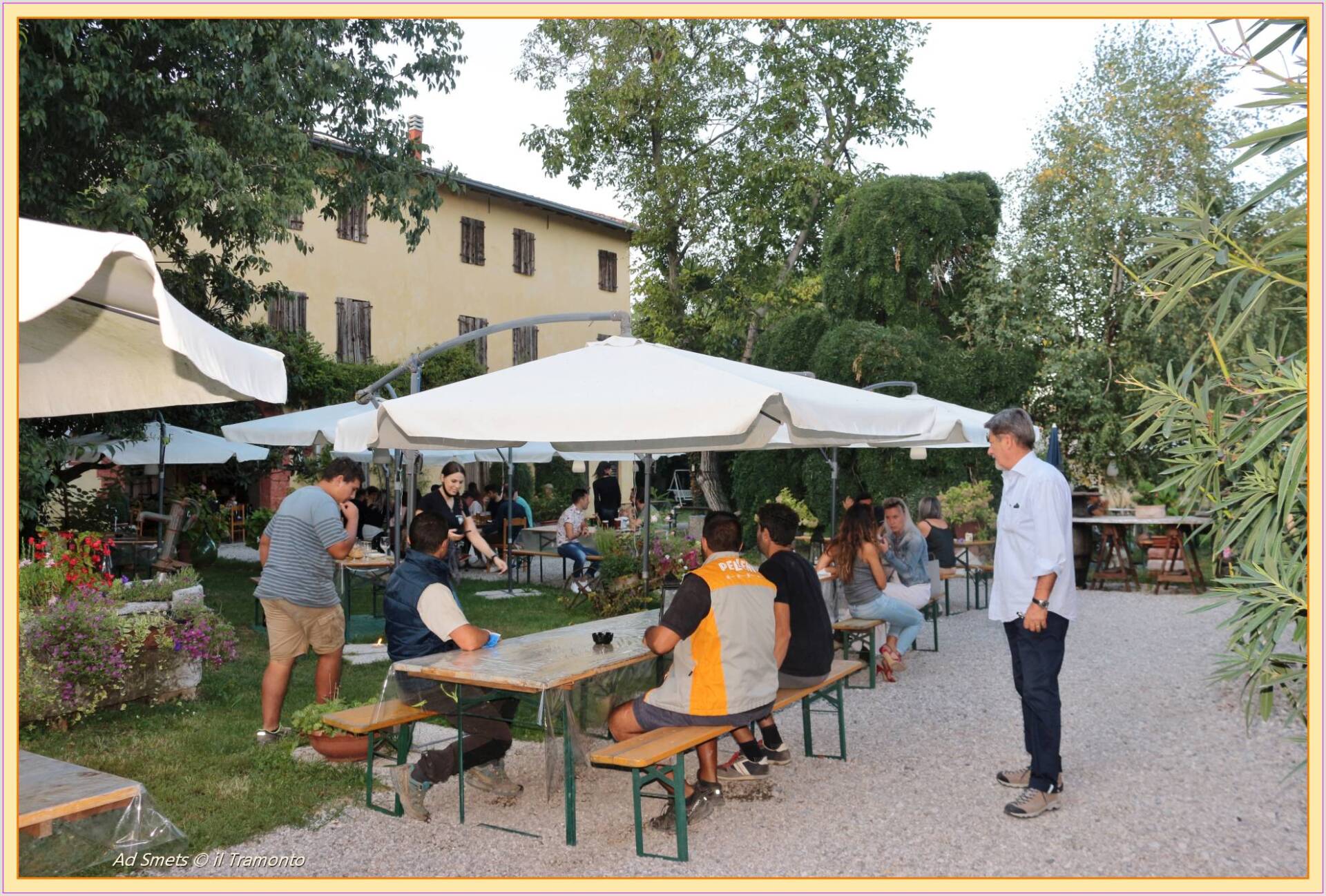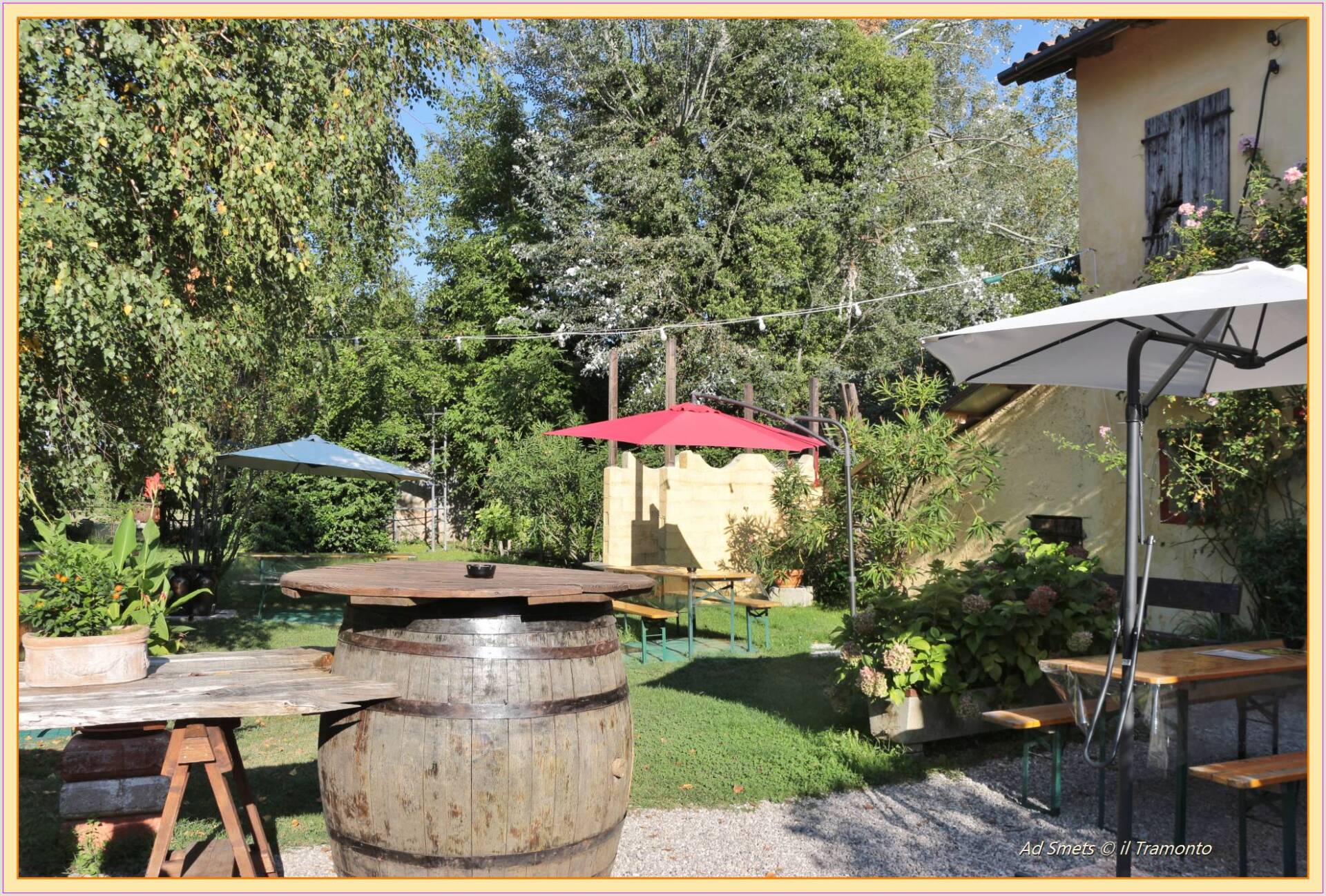Het plaatsje Giovanni di Casarsa is niet groot en toch moesten we even goed opletten om het smalle zijstraatje niet te missen. Dankzij Google Streetview hebben we het gevonden. Het bleek een groene oase te zijn met in het midden een traditioneel Friulaanse boerderij annex stallen, tezamen een eeuwenoude borgo (privé dorpje) vormend van deze nobele familie. De stallen zijn omgetoverd tot een super gezellige uitspanning waar je wat kunt drinken en eten. De binnenplaats is helemaal toppie met het uitzicht op romantische hoekjes en plekjes waar tafels staan om met kleine gezelschappen lekker te kunnen genieten van een pint met wat lekkers erbij.