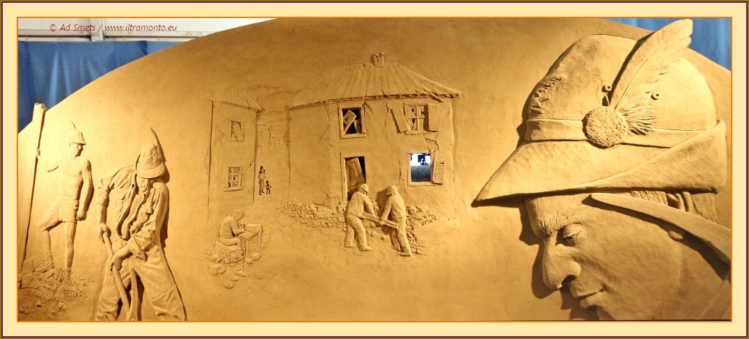 Een van de zandsculpturen stond in het teken van ’40 jaar na de aardbeving’. De Noord-Italiaanse regio Friulië werd op 6 mei 1976 getroffen door een zware aardbeving (6,4) die bijna 1000 levens kostte. (lees hier onze blog)