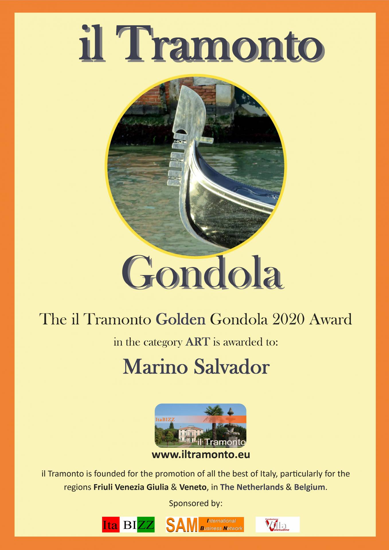 IL TRAMONTO GONDOLA d’ORO PREMI 2020-21 – Nella categoria ‘arte’ il premio Gondola d’Oro Award 2020 è stato assegnato all’artista Marino Salvador.