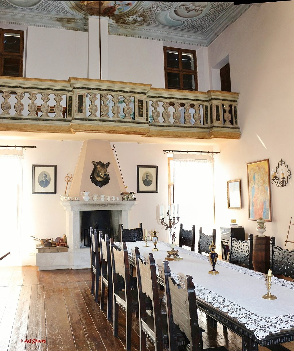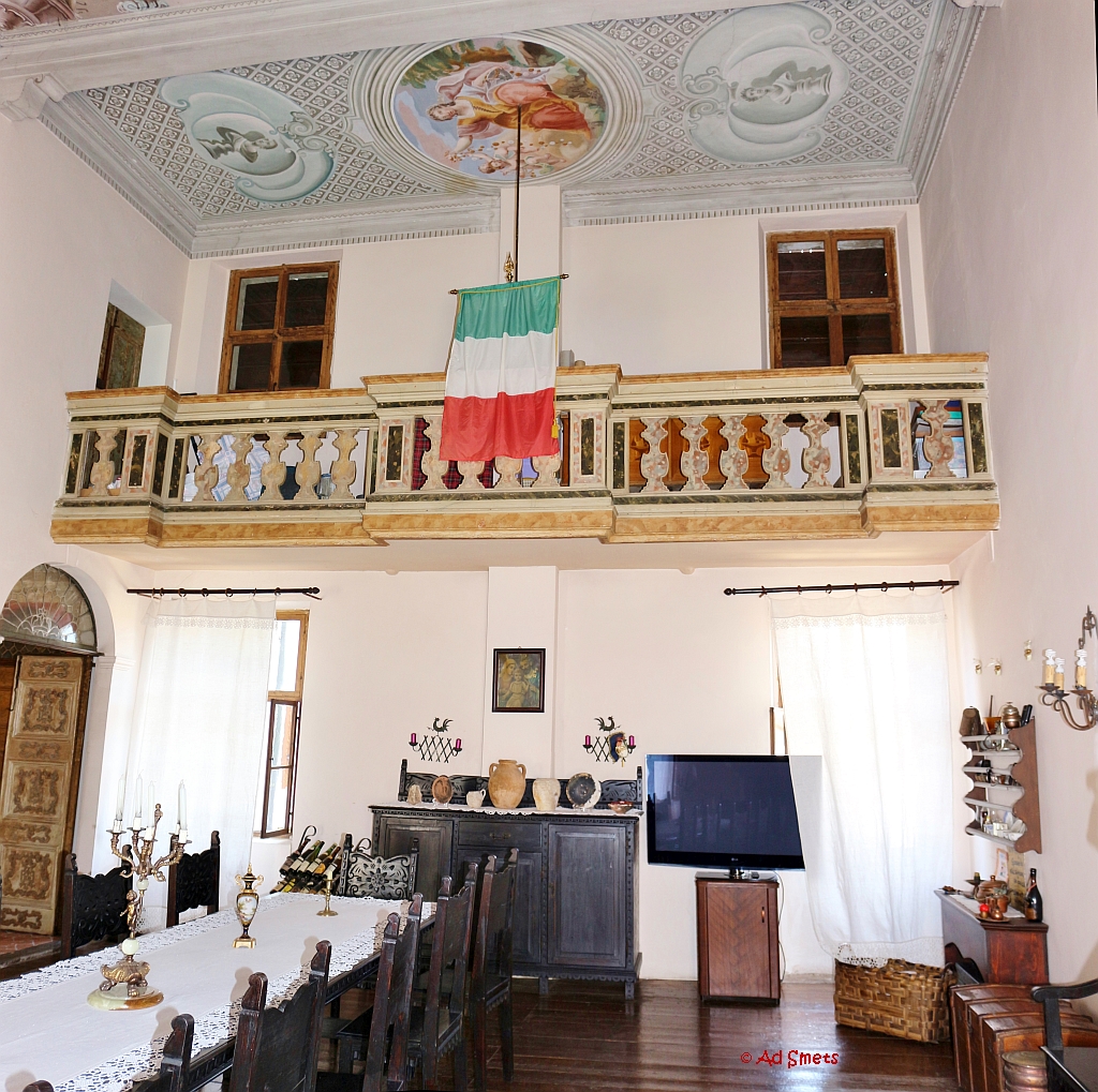 Tijdens de privé-rondleiding door Nicoletta Pressacco, dochter van de huidige eigenaar, realiseerden we ons dat ook dit een verborgen parel was. Van binnen tig keer mooier dan de buitenkant doet vermoeden. De uitgesleten stenen trappen met aan het plafond het familiewapen bracht ons naar de slaapvertrekken en de grote salon. De salon besloeg twee etages en heeft aan beide kanten een houten balkon. Een plafond met verschillende fresco’s met allegorische onderwerpen, zoals je in vele Venetiaanse villa’s aantreft. De overleveringen vertellen dat het hier werken betreffen van een anonieme 18e eeuwse kunstenaar.