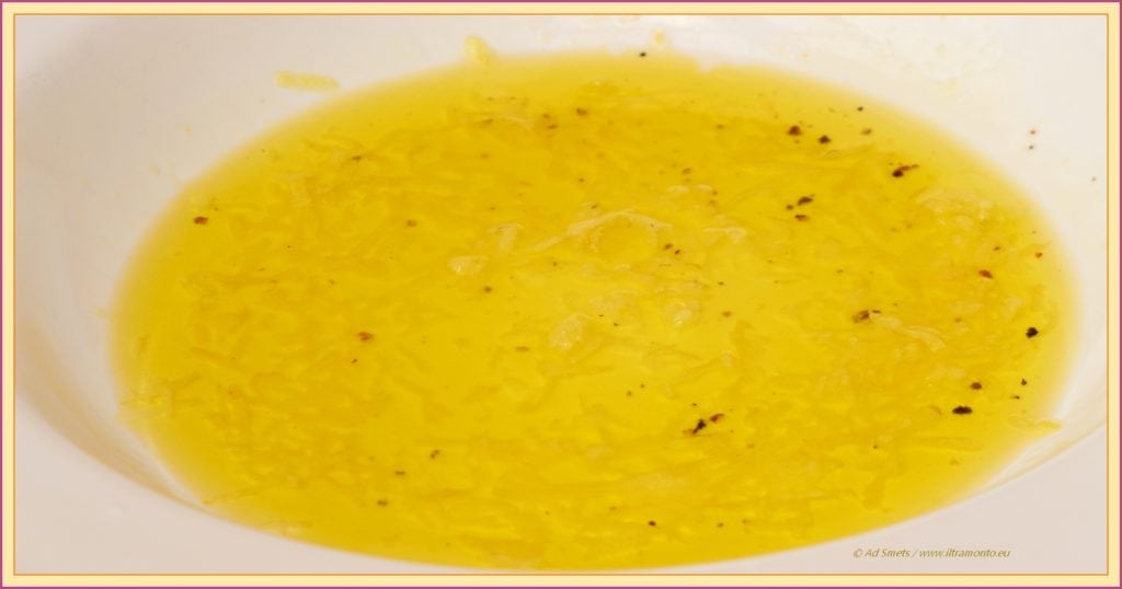Giet 5 eetlepels olijfolie in een diep bord, voeg de citroenrasp, het citroensap, de geperste knoflook, gemalen peper en een klein beetje zout toe. Meng dit mengsel met een lepel en laat even de smaken intrekken.