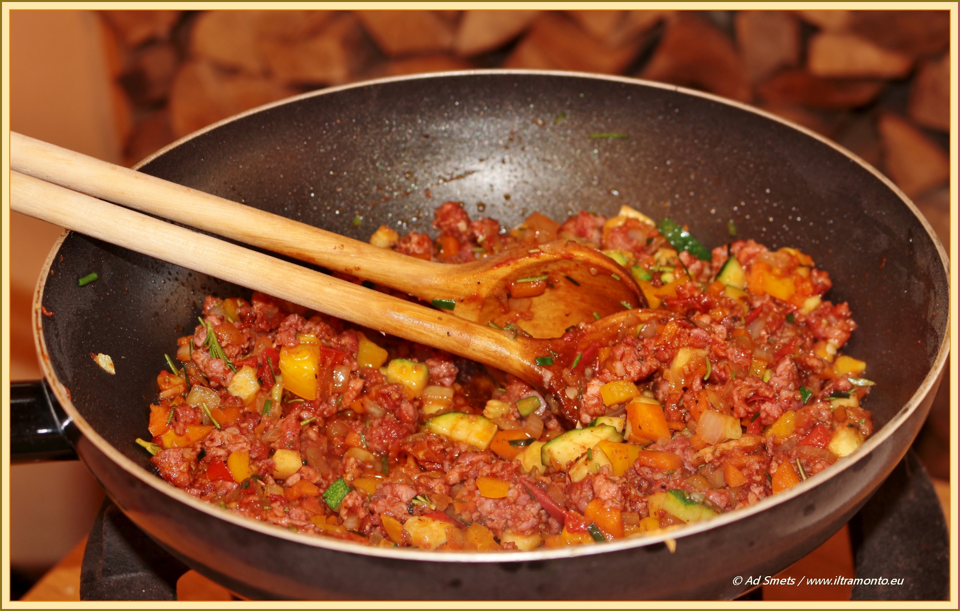 Tip: Je merkt dus dat wij nauwelijks kruiden of specerijen uit een potje gebruiken. Zelfs peper doen wij er niet in. Op het moment dat je echte Italiaanse salsiccia-gehakt gebruikt, dan zitten daar al voldoende specerijen in en kun je het gerecht verder zo puur en natuurlijk houden, zoals wij je het hebben voorgedaan.