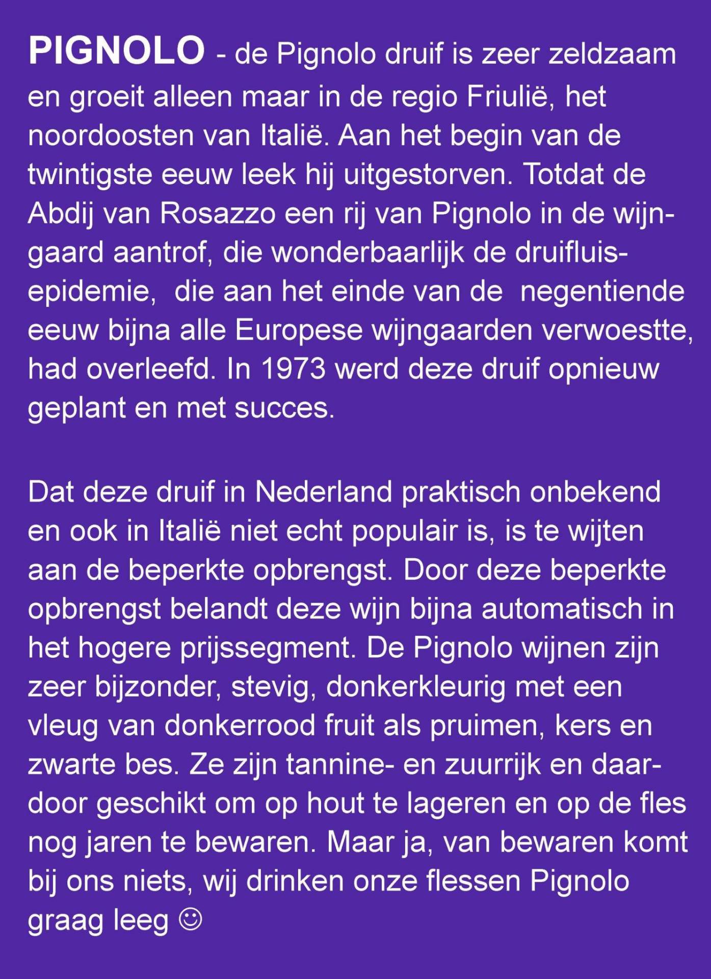 We zijn hele gewone mannen en lopen echt niet over van verwaandheid en bovendien vinden wij het onzin om te denken dat je over de rug van anderen je eigen status kunt verhogen. Dat waanbeeld laten wij aan anderen over, wij zijn wie we zijn: gewoon twee lieve, gezellige en sociale smulpapen! Wij blijven met beide benen op de grond staan al waanden wij ons wel even heel speciaal dat wij door een van de hoogst aangeschreven wijnhuizen van deze Italiaanse regio werden uitgenodigd om hun top 3 rode wijnen te waarderen voor il Tramonto (Schioppettino Romain 2012 – Refosco Romain 2012 – Pignolo Romain 2010). In deze blog vragen wij je warme aandacht voor de Pignolo, een druivensoort die alleen in Friuli Venezia Giulia voorkomt.