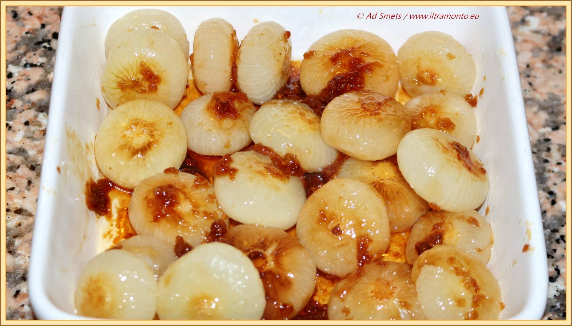 Ik braad deze blanke en uitdagende uitjes kort in een beetje olie aan totdat je op sommige plekken ziet dat ze beginnen te kleuren. Dan doe ik er bier bij, een scheutje blanke natuurazijn en een theelepeltje bouillonpoeder en laat de uitjes kort nagaren. Let op dat ze nog glazig / knapperig blijven. Want nu komt het leuke deel. Als het bier is verdampt, doe ik er een flinke klont boter bij en strooi er suiker overeen om ze licht te karamelliseren. Op een klein pitje laat ik de uien rustig smoren waarbij ik ze geregeld omdraai. Als de uien een mooie lichtbruine kleur hebben zijn ze goed. Let dus goed op dat ze niet snotgaar worden.
