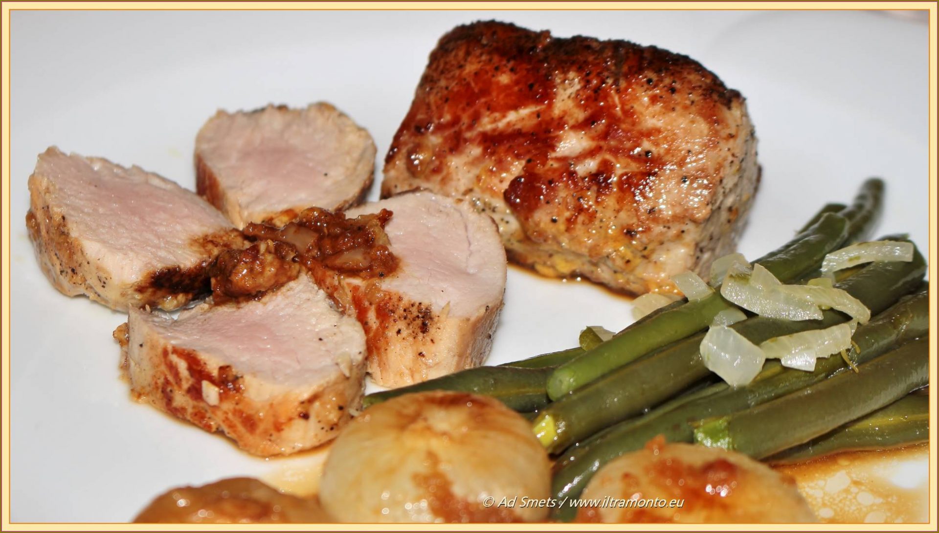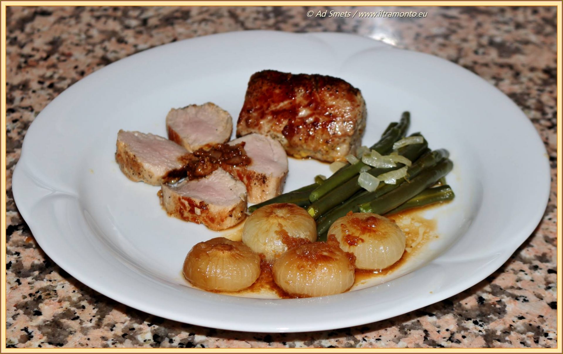 Sjaak en ik waren ‘ons eens geworden’ over wat we bij deze verrukkelijke fles wijn – wat een klein vermogen kost – zouden gaan klaarmaken. Het moest iets worden rondom een mals stukje rozig varkenshaas, geen rood vlees en geen vitello (kalfsvlees), waar volgens ons wijn van een andere druif beter bij combineert. Geen aardappels erbij om ons toch weer eens te houden aan de spelregels van Montignac. Die ken je toch nog wel, of niet dan? Destijds, 20 jaar geleden, waren wij er 12 (Sjaak) en 11 kilo (ik) bij afgevallen. Maar waarmee mogen we het haasje dan wel garneren? Juist ja, alleen groenten, zoals licht gekaramelliseerde uitjes (Friulaanse variant op de wereldbekende cipolline borettane in agrodolce) en in boter gefruite boontjes (die ze hier in Friulië tegoline noemen) met uisnippertjes. Iets wat wel kan in fase 2 van Montignac ook al gebruik je een beetje suiker!