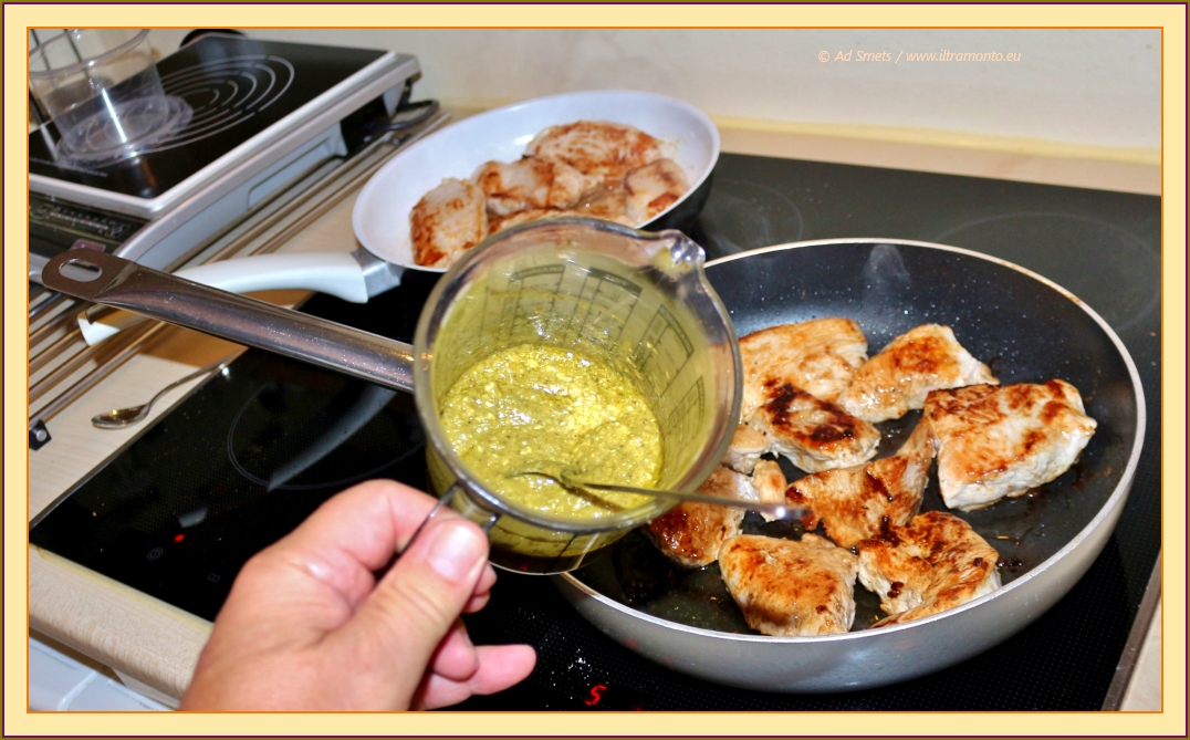 Voeg pas de laatste twee minuten de geperste knoflooktenen toe aan de kip.