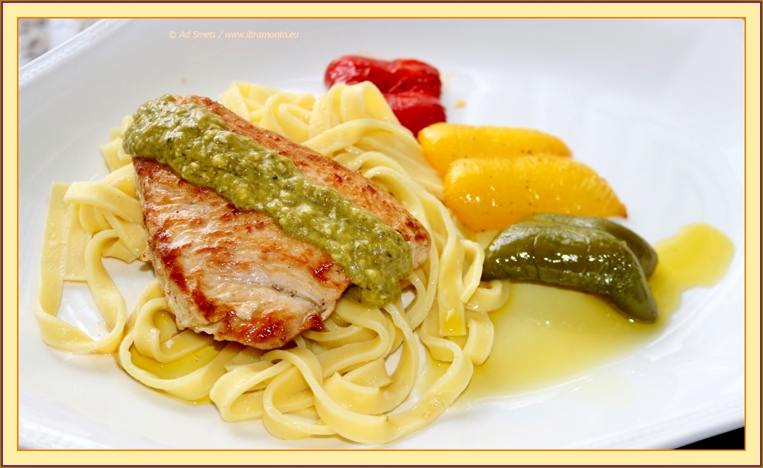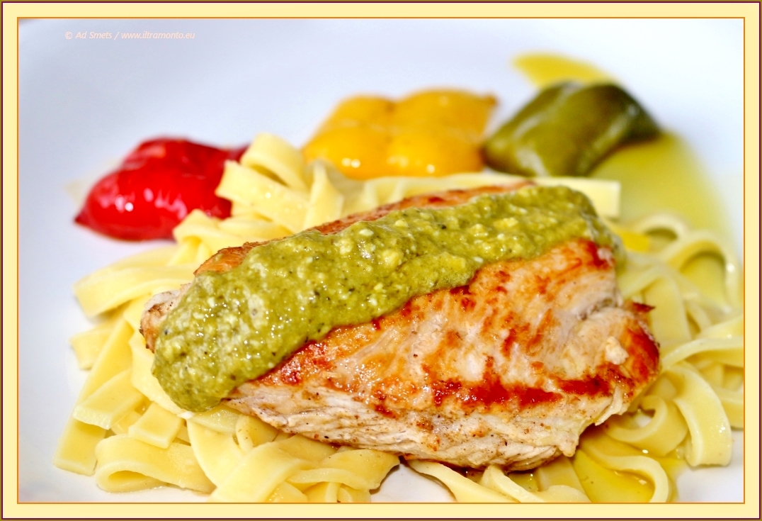Vertaald in het Nederlands: viervoudig ‘P’: pasta, pesto, paprika en ……. prachtige kip recept voor 4 personen