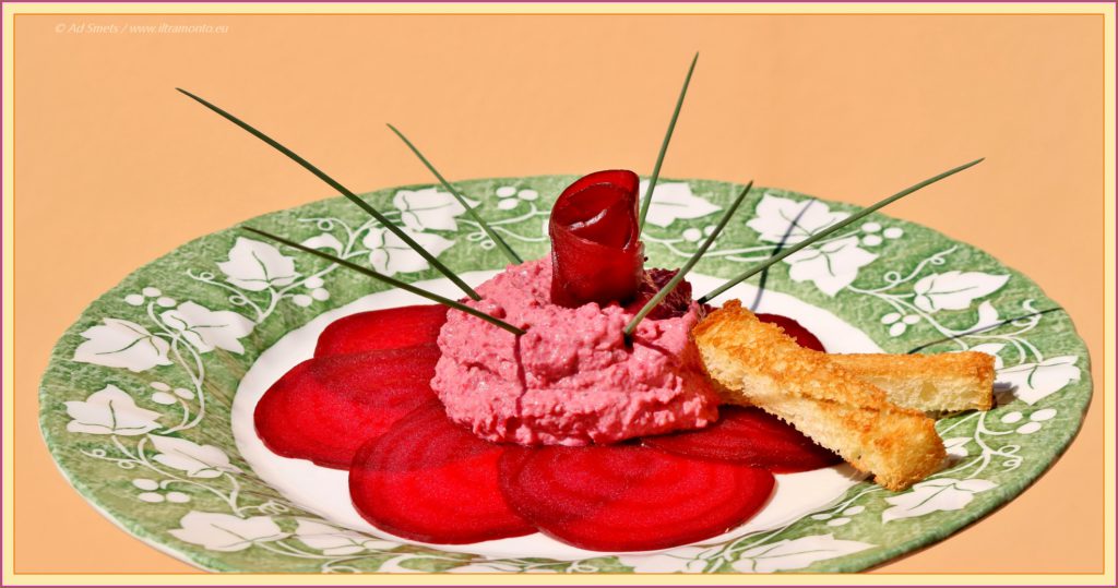 MOUSSE DI SGOMBRO & BIETOLA ROSSA – Een kleurrijk gerecht: carpaccio van rode biet met een mousse van makreel en rode biet.