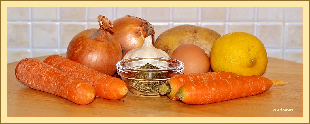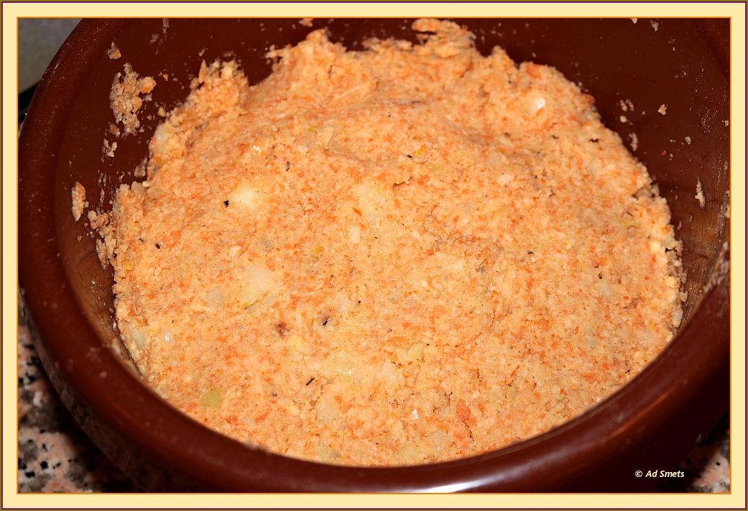 Rasp wortel, ui, knoflook en gekookte aardappelen (of verwerk in de keukenmachine) en snijd de vis tot kleine stukjes (kan ook in de keukenmachine). Voeg de citroenrasp, rauw ei, peper en zout en naar keuze peterselie of bieslook.