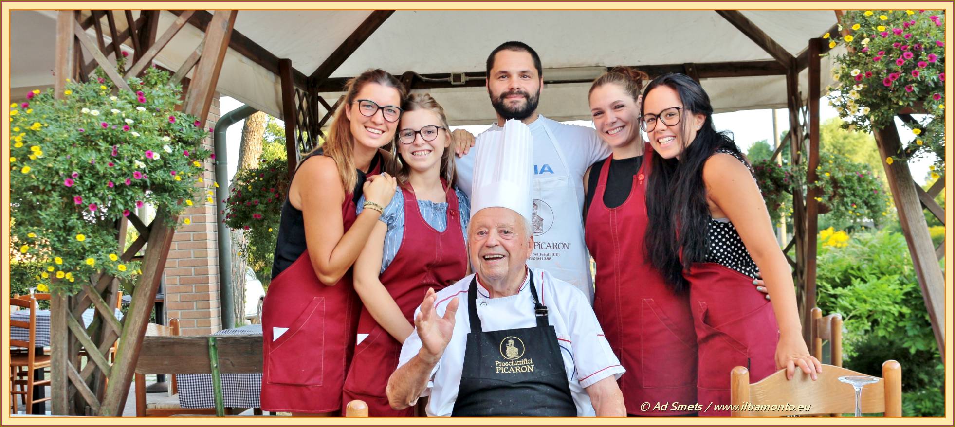 Zijn super lieve dochter Marina (getrouwd met Antonio) en zijn zoon Mario (getrouwd met Loredana die helaas na een korte doch hevige ziekte in 2016 is overleden) hebben jaren terug de zaak overgenomen en beiden werken met hun hele gezin vol overgave om de azienda agricola van Lino Buffon traditiegetrouw voort te zetten. Vol overgave, ik herhaal het aangezien de meesten van de familie overdag een reguliere baan hebben en ’s avonds flink meewerken in het restaurant. Wij hebben de zonen van Marina (Massimo en Antonio) van kinds af aan zien opgroeien tot volwassen mannen. De oudste is inmiddels zelf al pappa. Kun je nagaan hoe de tijd vliegt.