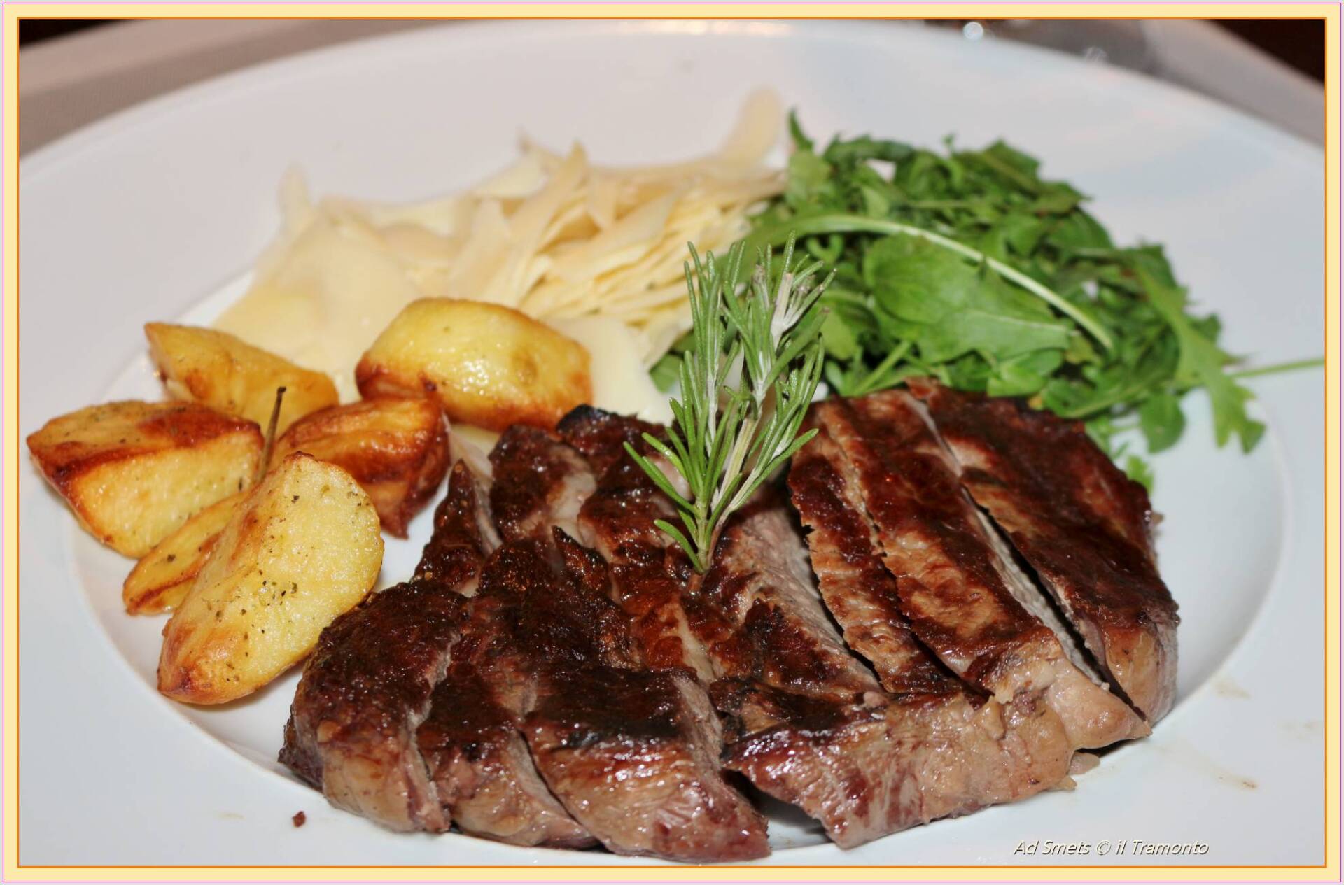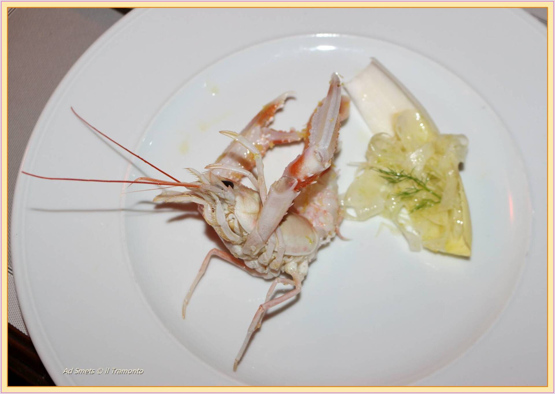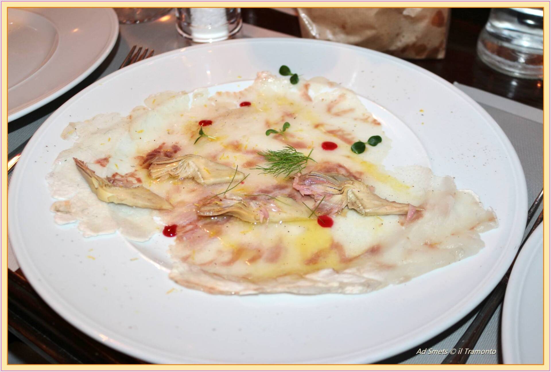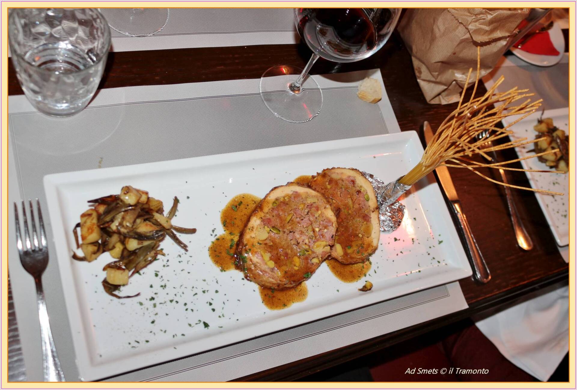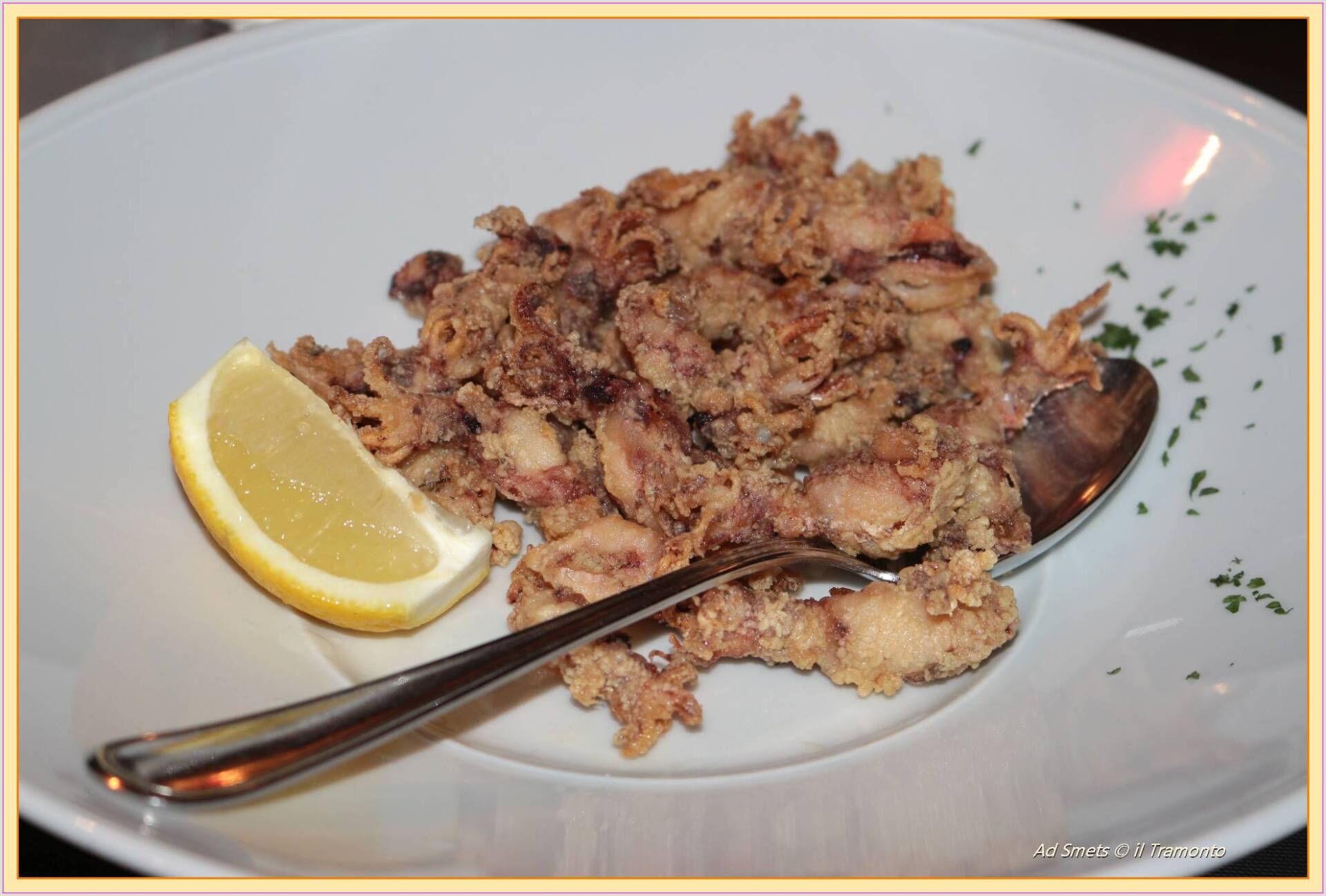 Al gaan wij vooral voor vlees, we kiezen niettemin voor een caleidoscopisch geheel aan antipasti en primi vanuit de nabijgelegen plas, de Adriatische Zee. We wonen niet voor niets aan de prachtige ‘Golf van Venetië’. Helaas weten we niet (meer) waar en wanneer de ‘appetizers’ overgingen in de voorgerechten maar het was verrukkelijk! Meer dan dat!
