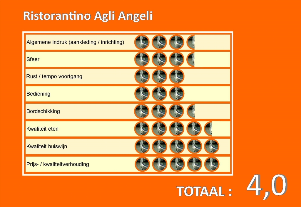 Wij boffen met zo’n fijn restaurantje in ons eigen dorp want ristorantino Agli Angeli heeft alles wat een buongustaio (lekkerbekje) wenst, of het vlees, vis, pizza’s, toetjes dan wel salades is. Wij dagen je uit en ga er zeker een keer eten.