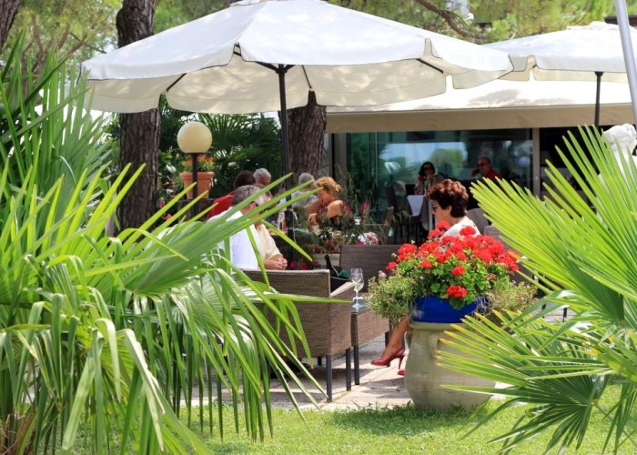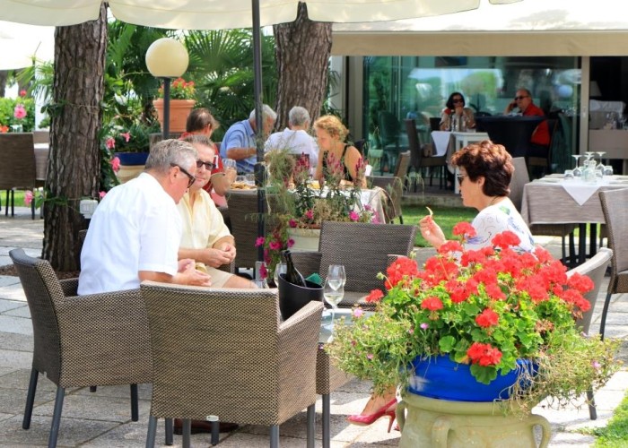 La Bricola, genoemd naar de houten palen die in de kanalen staan om de (water)weg aan te duiden, is een prachtig restaurant met een bijzonder uitzicht over de haven. Mooi gedekte tafels met veel glazen, iets waar we toch wel gevoelig voor zijn. Smaakvolle tuin, bloemen. Perfect! Jeetje, en wat een (kleur)rijke mensen! Ze zaten er zowat in de zwembroek en de bijna ontblote bovenlijven lieten een rijk aan plakplaatjes zien. In ieder geval sjieke kleuren!