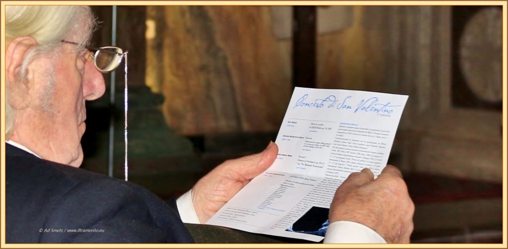De 88-jarige maestro Gustavo Zanin was ter ere van dit orgelconcert aanwezig (zie foto boven). Gustavo Zanin is werkelijk een persoonlijkheid, een bijzondere verschijning. We komen hem regelmatig tegen en hij is altijd in voor een praatje en een goed glas wijn. Enkele jaren geleden werd hij benoemd tot ‘laurea honoris causa’ (een soort bijzonder hoogleraar) en onlangs werd een muziekprijs naar hem vernoemd, een jaarlijkse prijs die wordt toegekend aan jonge talentvolle muzikanten.